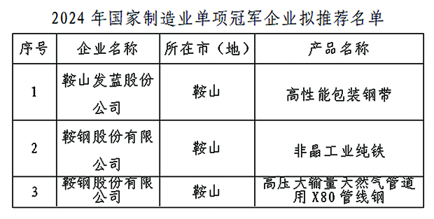 按照《工业和信息化部办公厅关于开展2024年制造业单项冠军企业遴选认定和复核评价工作的通知》(工信厅政法函〔2024〕328号)要求,鞍钢集团有限公司组织开展了2024年制造业单项冠军企业推荐申报工作,已完成初步论证,现将拟推荐名单予以公示(详见附件),公示结束后将推荐至工业和信息化部。